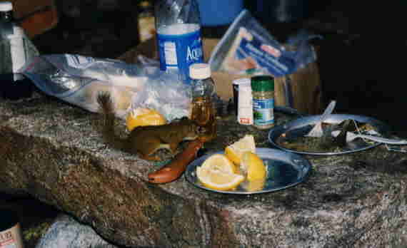 夕食の匂いを嗅ぎつけてリスが時々姿を現す。水は湖から調達。ろ過機は欠かせない。風呂も湖だ。